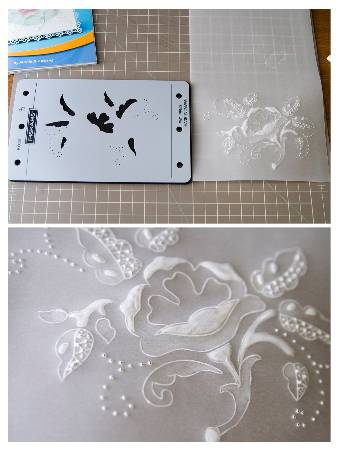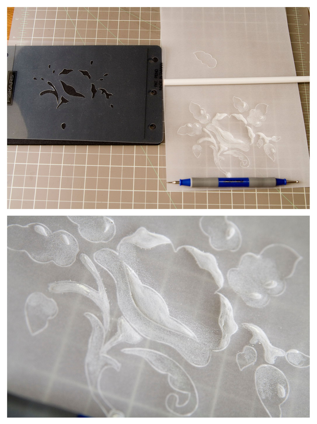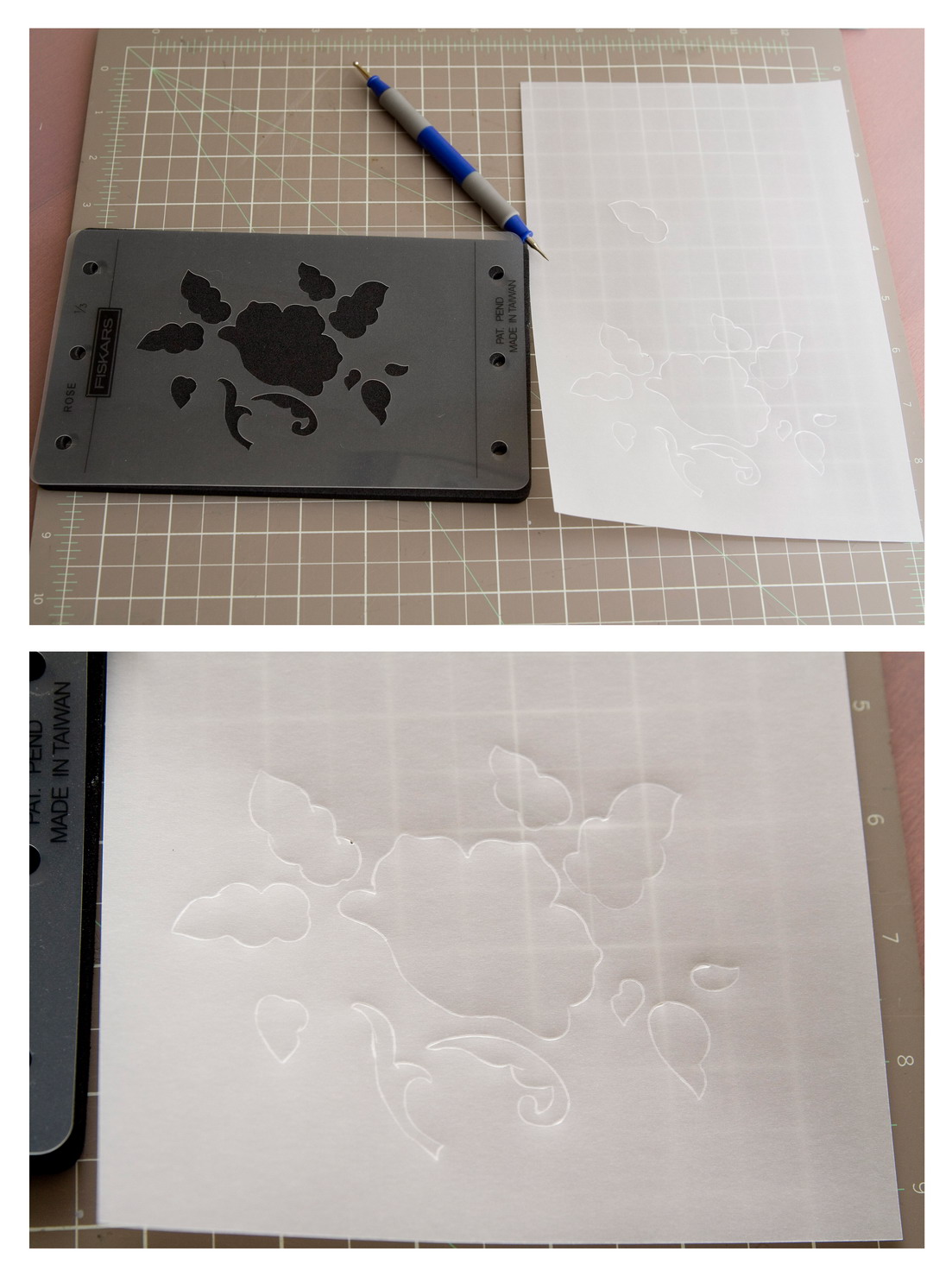 1 этап. бумага кладётся на коврик, сверху трафарет помесенный цифрой 1, и тоненьким концом инструмента очерчивается контур рисунка.