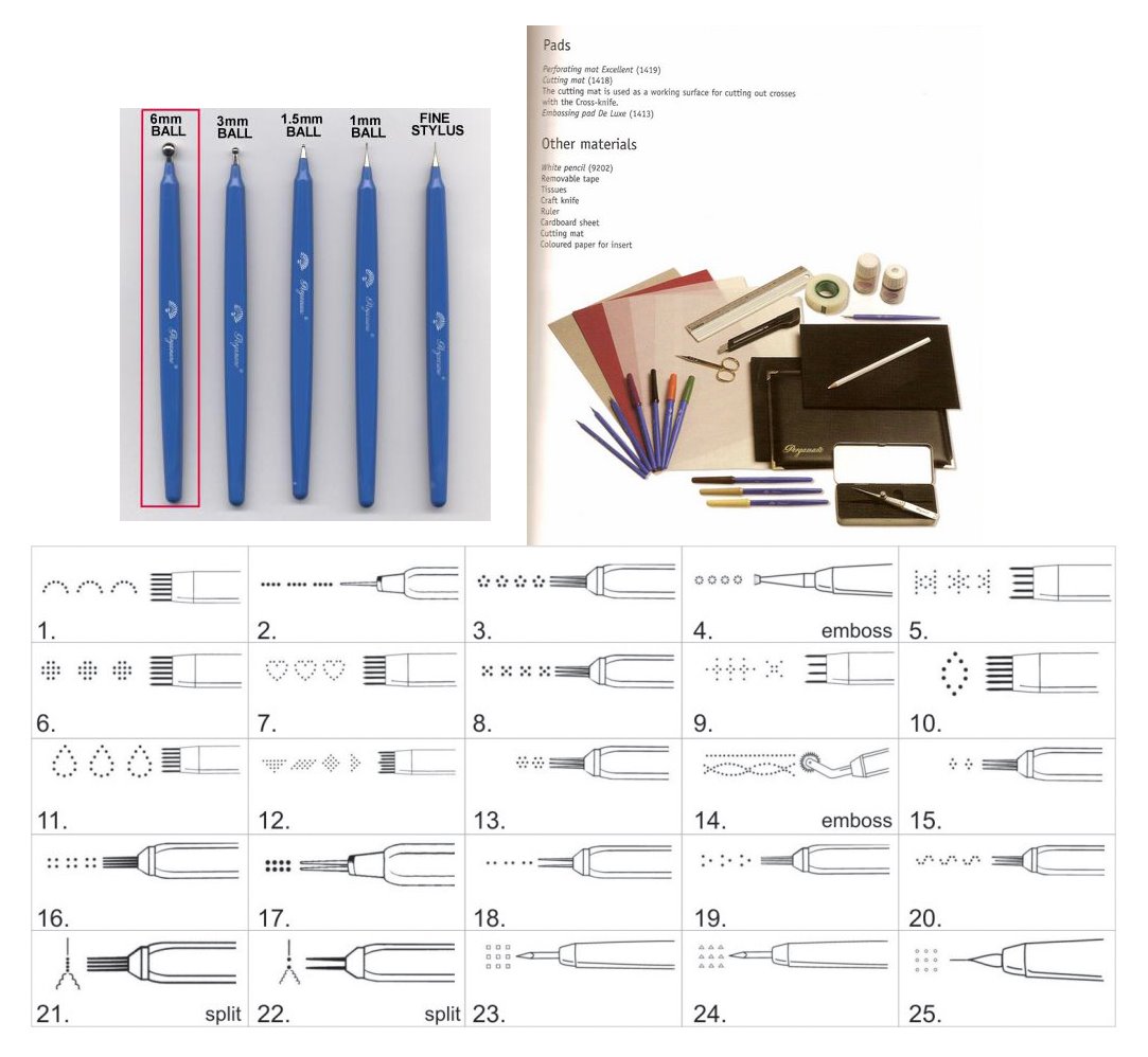 Вот например некоторые инструменты используемые в Pergamano. Обратите внимание, каково разнообразие наконечников для выдавливания, проколов и т.д.
