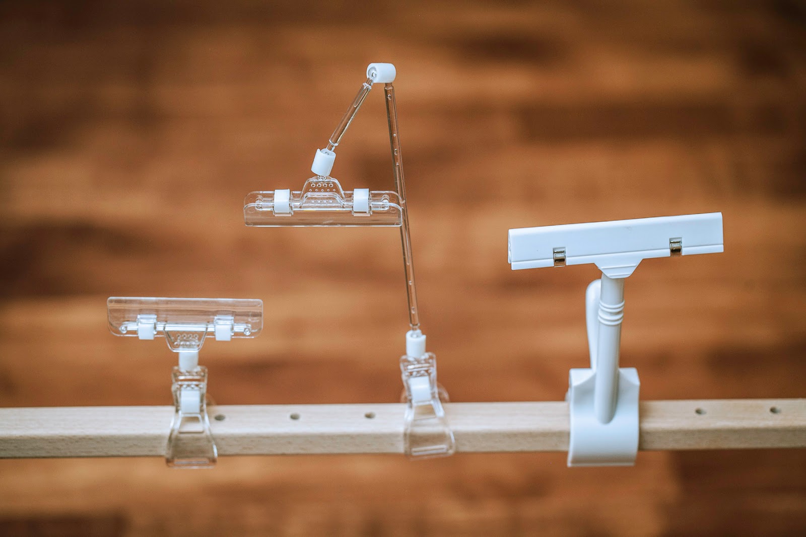 Обратите внимание на то, что держатели для ценников с прищепкой могут быть разными. Например, прищепка только на одном конце (которая крепиться на трубу), а вот куда вставлять ценник, может быть держалка для табличек, без прищепки